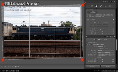 まず水平が気になる場合は、画面右にある水平補正の自動補正ボタンを押すと、写真の中にある垂直のものを基準に角度を矯正してくれます。基準になるものがない時は「ないので補正できなかった」旨のアラートが出るので、手動で角度矯正のスライドボタンを動かして補正します。