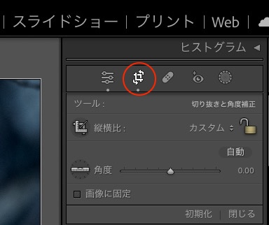 現像画面の右上のトリミングのマークを選ぶとトリミング作業の画面が開きます。